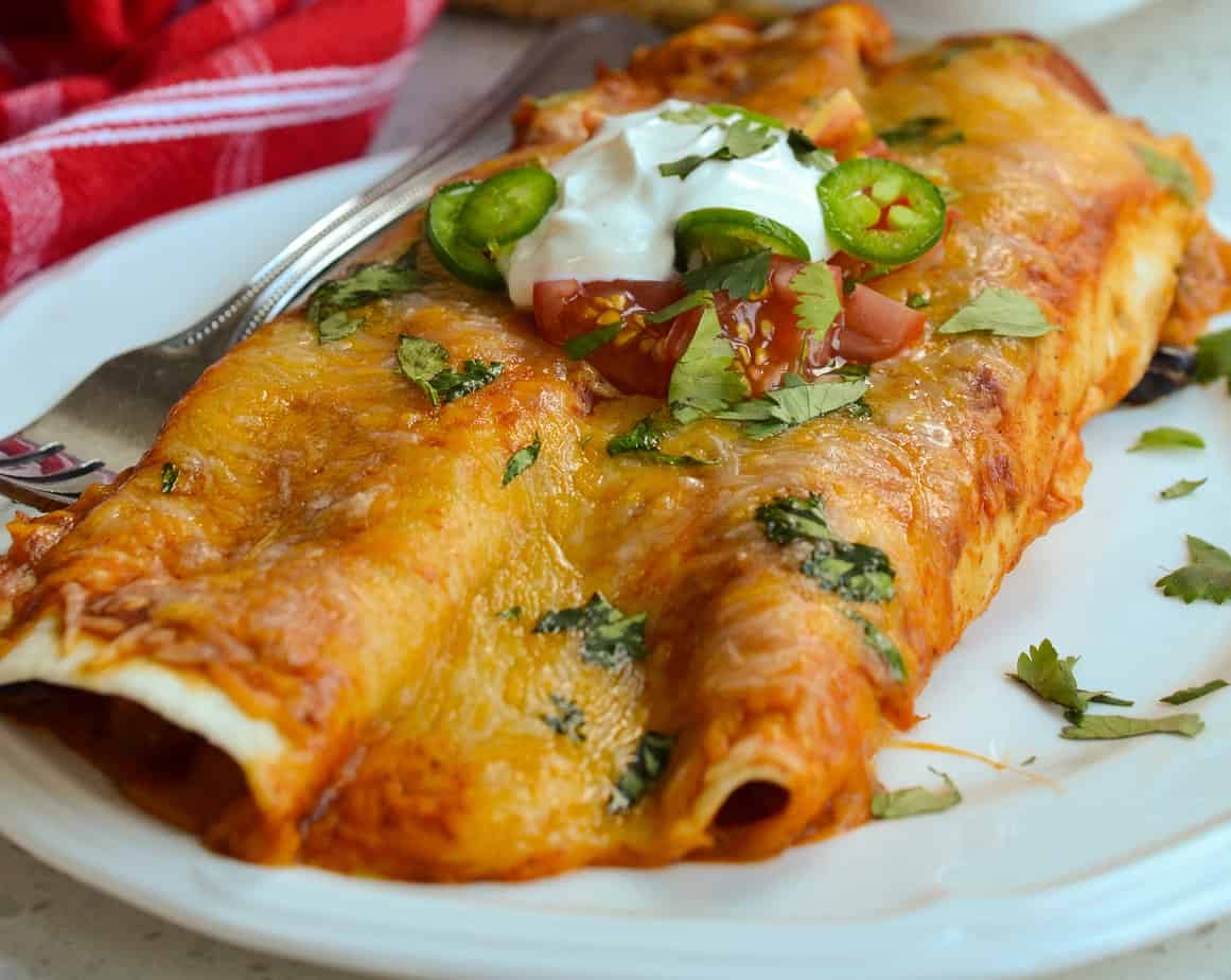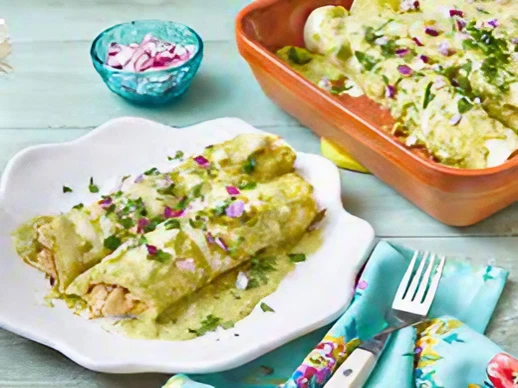 Las enchiladas consisten en tortillas de maíz rellenas, comúnmente de carne (pollo, res o cerdo), frijoles, queso o una combinación de estos. Las tortillas se enrollan y se colocan en una fuente para horno.